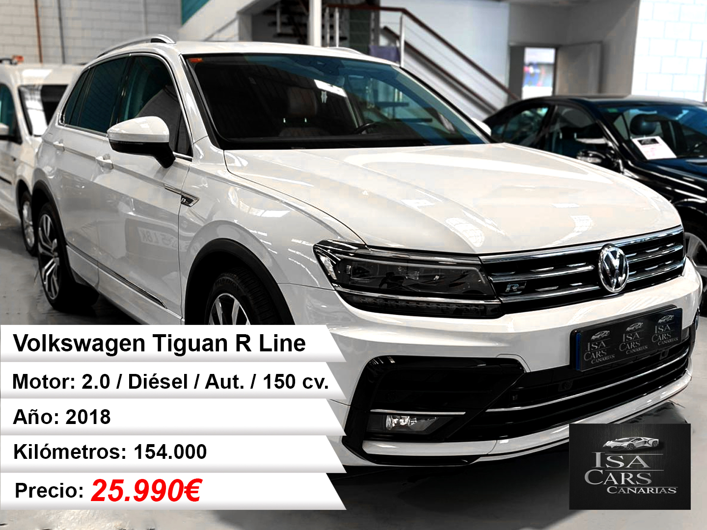Este Volkswagen Tiguan R-Line combina el carácter deportivo con la practicidad de un SUV compacto. Equipado con un motor diésel 2.0 TDI de 150CV, ofrece un consumo contenido, ideal para quienes buscan eficiencia sin renunciar a prestaciones.